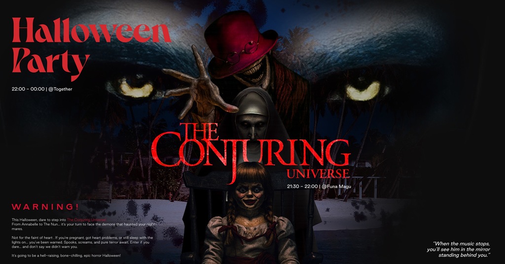• “Siyam World transforms into a live-action horror film set with an interactive walkthrough inspired by The Conjuring Universe. This isn’t just a simple haunted house; it’s a fully immersive experience where you’ll come face-to-face with characters like Annabelle, The Nun, La Llorona, and the Crooked Man. Brave the walkthrough, and you’ll be rewarded with access to a special dance performance and an electrifying Halloween party with live DJs.”