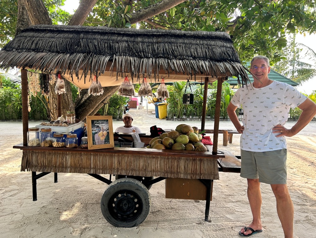 On most islands, landscaping staff will readily find a coconut for you direct from the trees, and some resorts have special stands to serve up free coconut, but at Siyam World guest get their coconut the Maldivian way. Coconut stands are the equivalent of the “water cooler” on local islands where locals gather to chat and hang out. Not only does Siyam World have a typical coconut stand, but they also recruited an actual coconut seller from a nearby island who was lured out of retirement to take his trade to the resort.