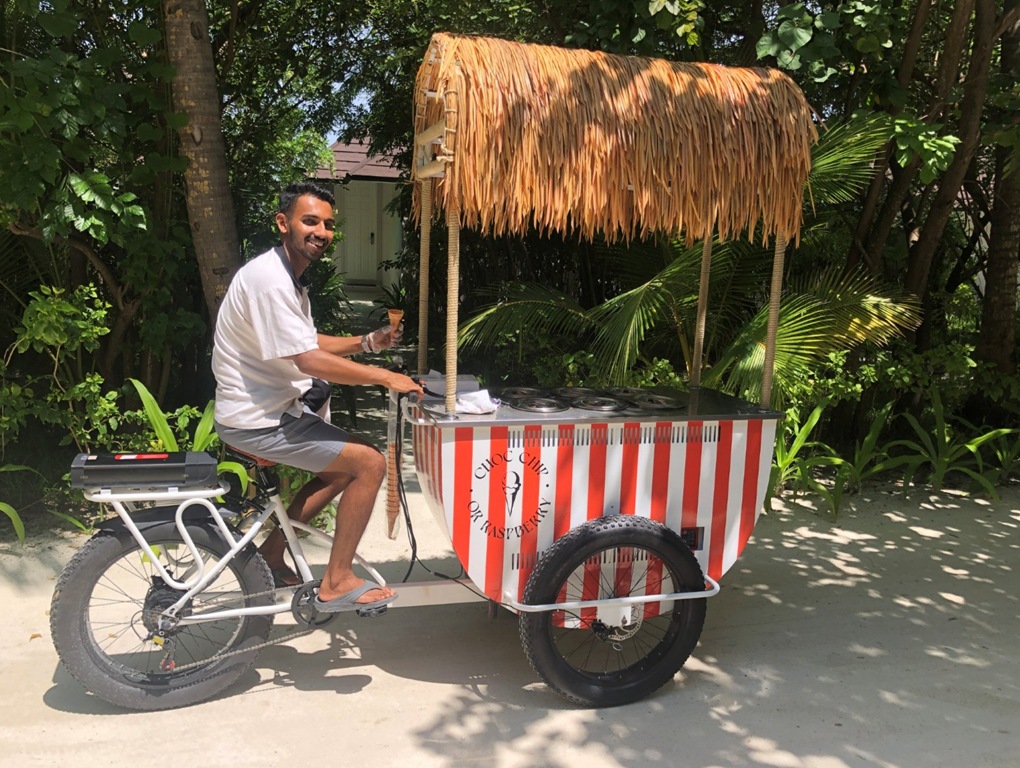 Santa might be delivering Christmas goodies to all the good little girls and boys tonight, but “DJ” delivers ice cream goodies to everyone all the time at Sun Siyam Olhuveli. He pedals around the property full-time to make sure that a tasty, cold treat is always on hand for the guests. Merry Christmas!