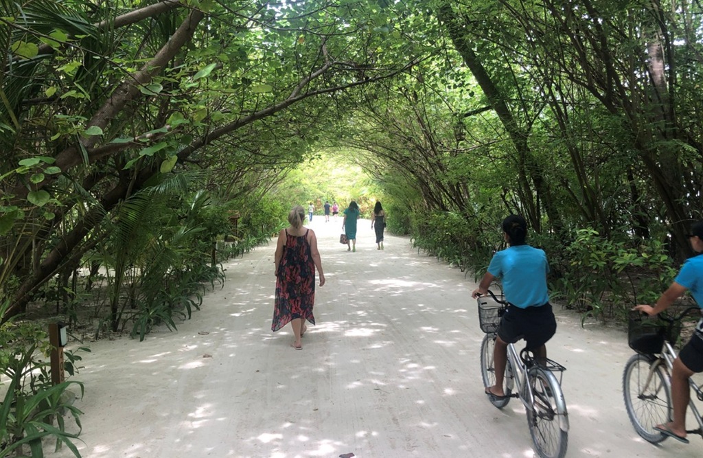 One of the charms of many Maldives islands, especially those with particularly lush vegetation, is that the flora can form a tunnel-like canopy over the paths literally enveloping you in its greenery. The overhead foliage provides an often welcome shade from the tropical sun (especially while you are doing a rare bit of exercising by walking or bike riding from one place to another). It’s easy for narrow footpaths to have such canopies, but we have never seen one span such a wide expanse as areas of Sun Siyam Olhuveli where a sandy lane wide enough for two buggies is densely shielded.